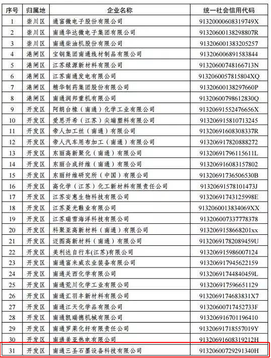 6月2日上午,南通市環(huán)保局公布了關(guān)于2016年度南通市區(qū)非國控企業(yè)環(huán)境信用等級(jí)評(píng)定結(jié)果的通知,經(jīng)對(duì)南通市區(qū)406 家非國控企業(yè)2016 年度環(huán)境信用進(jìn)行評(píng)審,確定南通三圣石墨設(shè)備科技股份有限公司等50家單位為綠色企業(yè)。