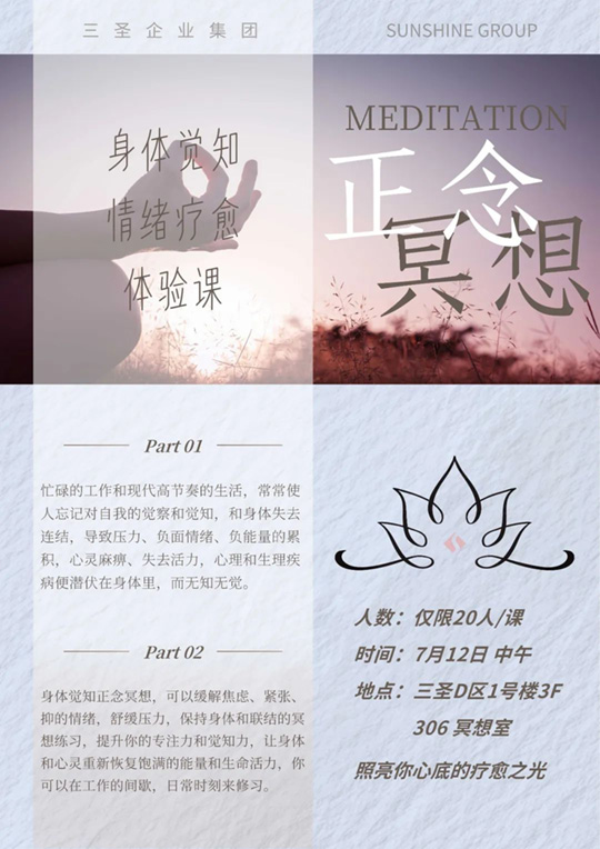 三圣集團最新開設(shè)的冥想課程,旨在幫助職工通過冥想達到內(nèi)心的寧靜與平和,提升個人的情緒管理、專注力和生活質(zhì)量。隨著今天第一堂體驗課的啟動,之后每周都有免費的公益課程可報名參加。這一全新形式的開放課程,升華了三圣企業(yè)文化的精神內(nèi)涵。