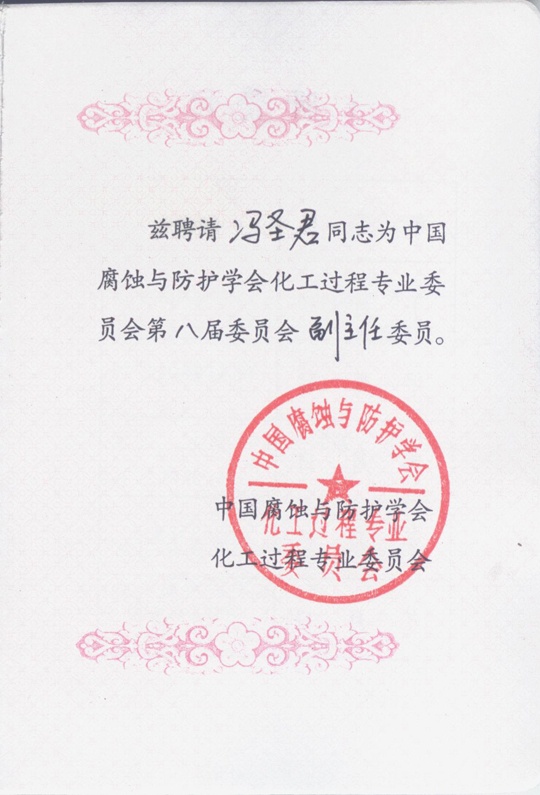 鑒于馮圣君在中國(guó)腐蝕與防護(hù)領(lǐng)域的杰出貢獻(xiàn)與不懈追求,中國(guó)腐蝕與防護(hù)學(xué)會(huì)經(jīng)過(guò)認(rèn)真考察,決定聘任其擔(dān)任化工過(guò)程專業(yè)委員會(huì)副主任,代表企業(yè)界參與學(xué)會(huì)工作。