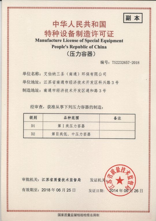 日前,艾伯納三圣(南通)環(huán)保有限公司順利取得了由江蘇省質(zhì)量技術(shù)監(jiān)督局頒發(fā)的《中華人民共和國(guó)特種設(shè)備制造許可證》。獲準(zhǔn)從事D1(第Ⅰ類壓力容器)、D2(第Ⅱ類低、中壓力容器)的制造,標(biāo)志著艾伯納三圣壓力容器生產(chǎn)的正式開始。